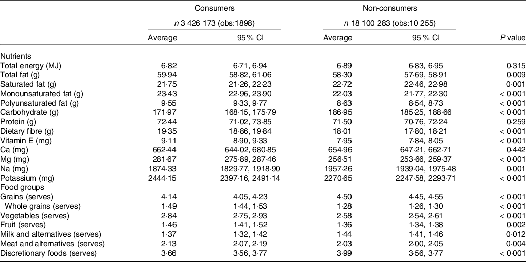 Compared with non-consumers, the intakes of avocado consumers were significantly higher in monounsaturated fats, polyunsaturated fats, dietary fibre, vitamin E, Mg and potassium (all P < 0·001) (Table 3). Avocado consumers had significantly higher intakes of ‘whole grains’ (P < 0·001), ‘vegetables’ (P < 0·001), ‘fruit’ (P = 0·002) and ‘meat and alternatives’ (P = 0·004) and lower intake of ‘grains’ (P < 0·001), ‘milk and alternatives’ (P = 0·012) and ‘discretionary foods’ (P < 0·001).