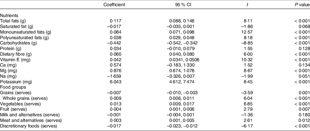 After adjusting for covariates, greater consumption of grams of avocados was associated with significantly higher consumption of monounsaturated fats (P < 0·001), polyunsaturated fats (P < 0·001), dietary fibre (P < 0·001), vitamin E (P < 0·001), Mg (P < 0·001) and potassium (P < 0·001), as well as ‘whole grains’ (P < 0·001), ‘vegetables’ (P < 0·001), ‘fruit’ (P = 0·007) and ‘meat and alternatives’ (P = 0·012) food groups. Non-significant associations were found between avocado consumption and saturated fats (P = 0·068), protein (P = 0·128), Ca (P = 0·134), Na (P = 0·051) and ‘milk and alternatives’ (P = 0·180). Greater consumption of avocados was associated significantly to lower consumption of carbohydrates and discretionary foods (all P < 0·001).