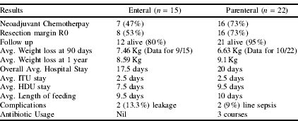 Discussion: The power of this study is limited by the low number of patients, however, both methods of nutritional support provide comparable outcomes, with weight loss appearing inevitable, mostly in the peri-operative period. There is a slightly increased risk of complications in jejunostomy feeding group where as increased length of HDU and hospital stay, and antibiotic usage in parenteral feeding group was noted.