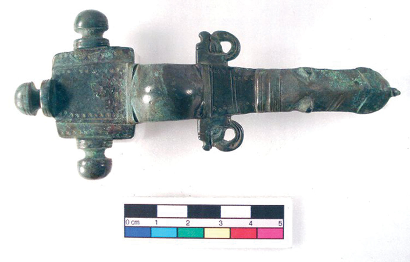 Figure 2. Nydam-style chip-carved decoration on a brooch from Kent. These brooch types originate in Scandinavia, but show clear Roman stylistic influence (early fifth century AD, scale in centimetres, brooch is approximately 80mm in length; photograph courtesy of The Portable Antiquities Scheme).
