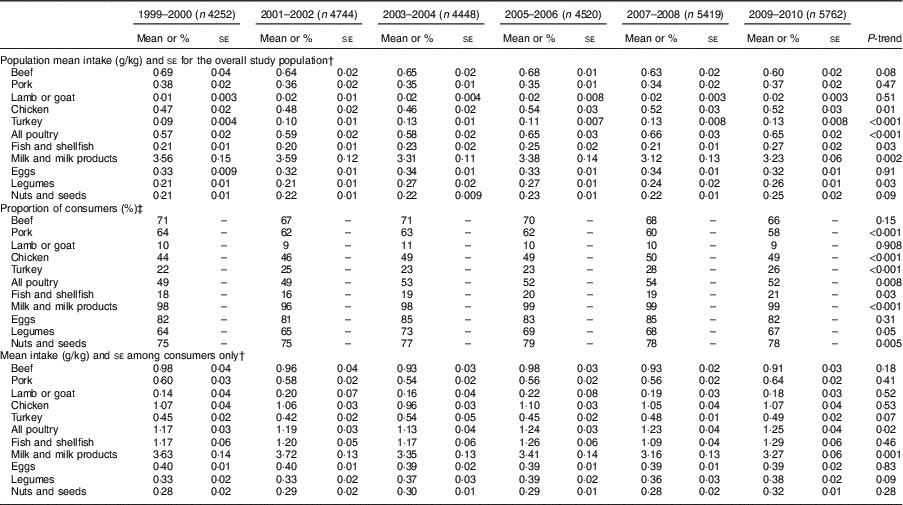 When we adjusted for total energy intake instead of body weight, the results did not change (data not shown). However, when we repeated our analyses from 2003 to 2010 when two dietary recalls were available, we found that mean (se) beef intake decreased (0·66 (0·02) to 0·61 (0·02) g/kg; P-trend = 0·03) and no change was observed for turkey (0·12 (0·01) to 0·13 (0·005) g/kg), fish (0·23 (0·02) to 0·26 (0·02) g/kg), dairy (3·38 (0·13) to 3·26 (0·06) g/kg) and legumes (0·28 (0·02) to 0·29 (0·01) g/kg; all P-trend >0·05; see online supplementary material, Supplemental Table 9). The results on pork, lamb or goat, chicken, all poultry, and nuts and seeds intake did not change in sensitivity analyses.