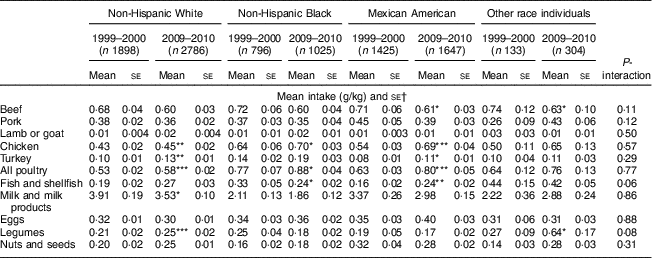 When consumption of types of protein (among consumers and non-consumers) was examined by subgroups, mean (se) egg intake increased for men (0·33 (0·02) to 0·34 (0·02) g/kg) but decreased for women (0·32 (0·01) to 0·30 (0·01) g/kg; P-interaction = 0·01; see online supplementary material, Supplemental Table 6). Fish (P-interaction = 0·06) and legume (P-interaction = 0·08) intake differed by race/ethnicity, with increasing intake of fish among non-Hispanic Whites (0·19 (0·02) to 0·27 (0·03) g/kg) and Mexican Americans (0·16 (0·02) to 0·24 (0·02) g/kg) but decreasing intake among non-Hispanic Blacks (0·33 (0·05) to 0·24 (0·02) g/kg) and other race individuals (0·44 (0·15) to 0·42 (0·05) g/kg; Table 2). Legume intake increased in non-Hispanic Whites (0·21 (0·02) to 0·25 (0·02) g/kg) and the other race group (0·27 (0·09) to 0·64 (0·17) g/kg), but decreased in non-Hispanic Blacks (0·25 (0·04) to 0·18 (0·02) g/kg) and Mexican Americans (0·19 (0·05) to 0·17 (0·02) g/kg).
