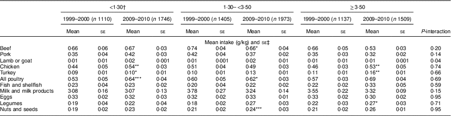 Among adults, mean (se) daily total meat intake (beef, pork, lamb or goat, chicken, turkey) did not change significantly (1·66 (0·04) to 1·64 (0·04) g/kg; P = 0·45) between 1999 and 2010. Beef, pork, or lamb or goat intake did not change, whereas the intake of recommended types of protein such as chicken (0·47 (0·02) to 0·52 (0·03) g/kg), turkey (0·09 (0·004) to 0·13 (0·008) g/kg), all poultry (0·57 (0·02) to 0·65 (0·02) g/kg), fish and shellfish (0·21 (0·01) to 0·27 (0·02) g/kg) and legumes (0·21 (0·01) to 0·26 (0·01) g/kg) increased (all P <0·03; Table 1). Nuts and seeds intake also increased over time but did not reach statistical significance (0·21 (0·01) to 0·25 (0·02) g/kg, P = 0·09). Dairy intake decreased (3·56 (0·15) to 3·23 (0·06) g/kg, P = 0·002) in the overall study population.