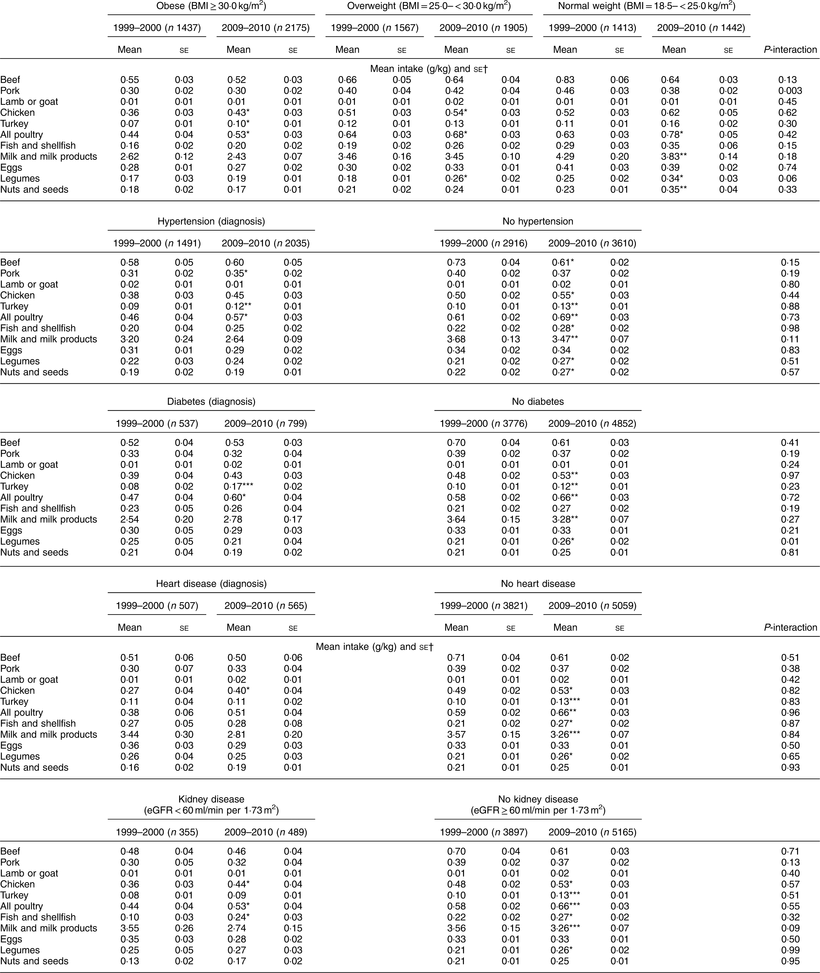 For most of the comparison groups, we found that the consumption of fish and shellfish, chicken, turkey, legumes, and nuts and seeds increased over time, similar to what was observed in the overall study population. Among individuals without hypertension, mean (se) beef intake decreased significantly (0·73 (0·04) to 0·61 (0·02) g/kg; P = 0·04). No significant change was observed for other types of protein among those without a chronic disease.