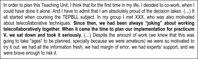 As we have seen in several fragments and online output, the students frequently brought up the notion that they were “learning by doing”, and their discussions were often meta-reflections of their own learning supported through the possibilities afforded by the telecollaborative exchanges. This is exemplified in the group post that followed the “collaborative exam”. The reflection, posted by the group discussion leader but written and edited by the entire group, highlighted how the discussion brought about through the online collaborative exam had made them realize they “have learned more than [they] thought during this subject”.