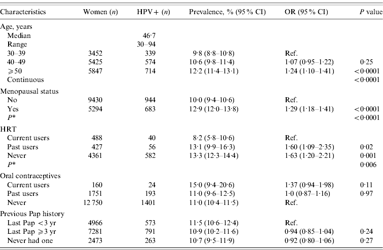 The prevalence of HPV infection was significantly associated with age (P<0·0001), menopausal status (P<0·0001), and inversely associated with hormone replacement therapy (P=0·006) in the merged cohort. There was no significant association between the use of oral contraceptives or the history of Pap smears with the prevalence of HPV infection (Table 1).