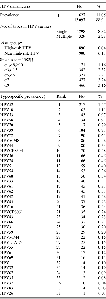 Cervical cancer remains a leading cause of cancer-related death in women [Reference Parkin1]. Several human papillomavirus (HPV) types are human carcinogens that play a key role in the pathogenesis of cervical cancer [Reference zur Hausen2, Reference Woodman, Collins and Young3]. However, the prevalence of HPV infections varies widely depending on the population studied. The International Agency for Research on Cancer (IARC) population-based studies showed that overall HPV prevalence varied 20-fold from 1·4% in Spain to 25·6% in Nigeria [Reference Clifford4]. In a recent meta-analysis estimating HPV prevalence in women with normal cytology using data from 78 published studies [Reference de Sanjose5], the adjusted global prevalence was 10·4%, with considerable variation by region.