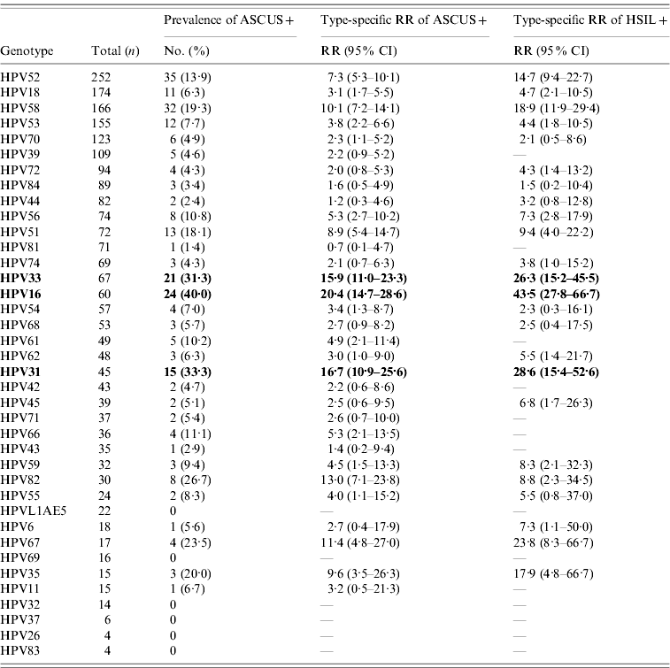 Table 4. HPV type-specific relative risk of abnormal cervical cytology in the merged cohorts (n=15 040)Footnote *