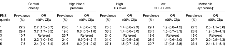 Table 6 Relationship between cardiovascular risk factors* and Foetal Nutritional Status Index (FNSI) among children 5–6 years of age by quintile of FNSI: the Third National Health and Nutrition Examination Survey (1988–94)