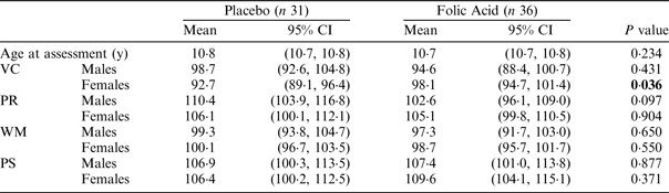 The results showed no significant effect of maternal folic acid on mean (95% CI) Full Scale IQ in children (boys or girls) at age 11 years: placebo 104·0 (100·7, 107·3) vs folic acid 103·1 (99·9, 106·3); (P = 0·699); data not shown. The significant effect of folic acid on Verbal Comprehension was evident only in female offspring (Table). Furthermore, children (both sexes) of folic acid treated mothers compared to the placebo group had significantly higher mean scores in the Cancellation subtest within Processing Speed: 93·2 (87·0, 99·5) vs 84·7 (77·9, 91·5); (P = 0·035), but not in any other domains or subtests examined (data not shown).