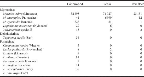 Table 1 Total numbers of individuals of each ant species captured in pitfall traps within study sites near the mouth of the Fraser River, southwestern British Columbia, Canada.