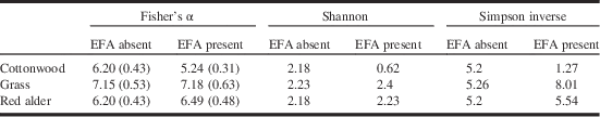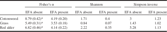 Notes: EFA–non-EFA pairs marked by an * are significantly different (by non-overlap of 95% confidence intervals; calculated as 1.96×SD). No determination of significant differences are made for Shannon and Simpson Inverse biodiversity estimates because they were calculated without measures of SD.