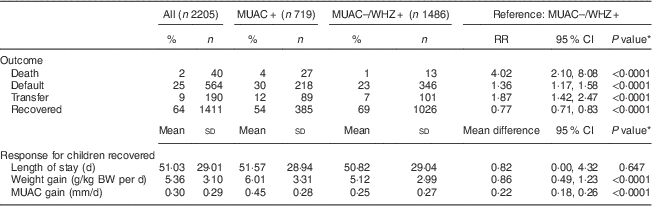 Children in the MUAC+ group were less likely to recover (54 % v. 69 %; P<0·0001) and experienced a higher risk of death (4 % v. 1 %; P<0·0001) and transfer to in-patient care (12 % v. 7 %; P<0·0001) compared with the MUAC−/WHZ+ group. In both groups, the risk of default was higher than the SPHERE standard of <15 %( Reference Goossens, Bekele and Yun 20 ), with the risk being significantly higher among the MUAC+ group compared with the MUAC−/WHZ+ group (30 % v. 23 %; P<0·0001; Table 2). Among recovered children, treatment response was more favourable among the MUAC+ group than the MUAC−/WHZ+ group: the MUAC+ group had a greater mean weight gain (6·01 g/kg BW per d v. 5·12 g/kg BW per d; P<0·0001) and greater mean MUAC gain (0·45 mm/d v. 0·25 mm/d; P<0·0001). Mean length of treatment was approximately 51 (sd 29·01) d overall and did not differ significantly between groups.