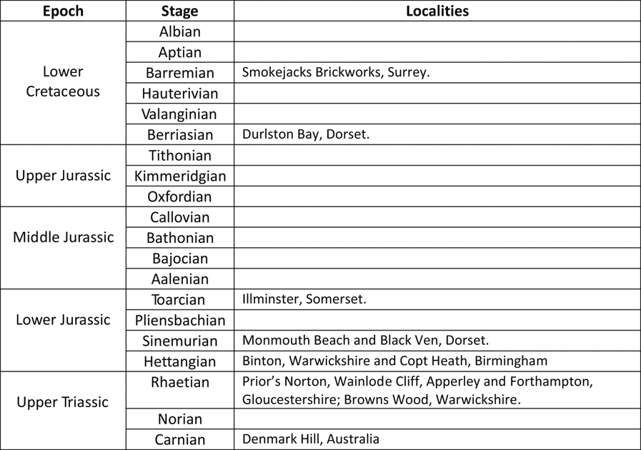 Brown's Wood, Warwickshire [SP 116 641] (Rhaetian). The stratigraphy of this locality has been described as being similar to Shelfield [SP 123 624] and Wainlode Cliff (Brodie Reference Brodie1863, Reference Brodie1865). The insect bed at Brown's Wood was located by Brodie (Reference Brodie1865), overlying the Estheria and Pecten beds, which are old terms for the Cotham Member and the Westbury Formation, respectively. Swift (Reference Swift1995) studied the occurrence of the White Lias throughout Britain. The White Lias is absent in Gloucestershire and is replaced by the Pseudomonotis bed; but in Warwickshire, the White Lias is present, so the insect-bearing bed lying above the Cotham Member is probably in the White Lias (Langport Member).
