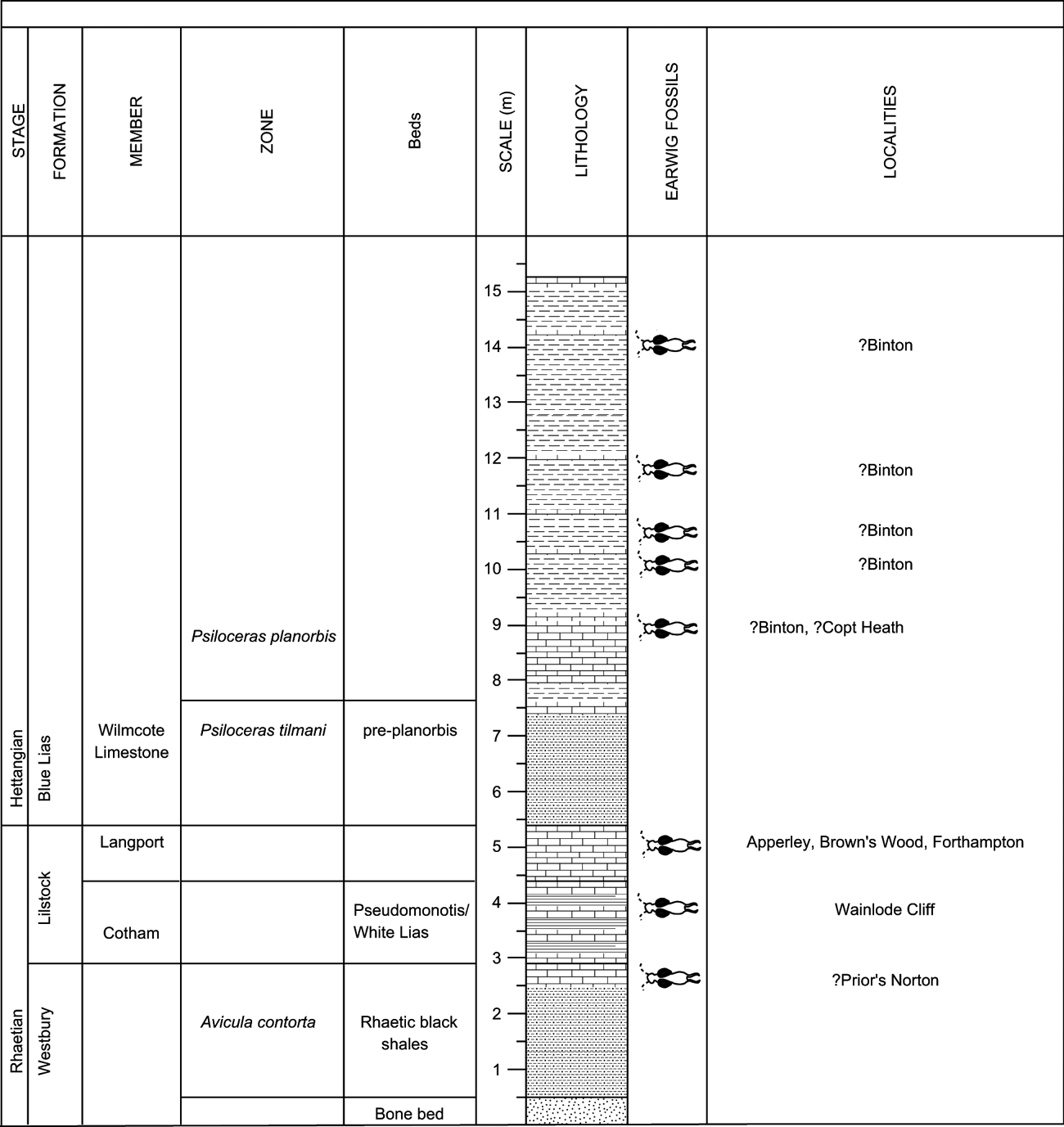 Binton, Warwickshire [SP 142 536] (Hettangian). Brodie (Reference Brodie1845) indicated that there were several localities and horizons that yielded insects at Binton. A section for one of them, Osborne's Pit, was published by Brodie (Reference Brodie1868), but it is uncertain exactly where this site was (Williams et al. Reference Williams, Whittaker, Cornwell, Day, Hawkes, Owens, Warrington and Ivimey-Cook1974, p.39). The insect limestones at Binton all lie above the Pre-planorbis beds (Ostrea beds), so are within the Psiloceras planorbis Zone (Richardson Reference Richardson1912). Wright (Reference Wright1860) details the stratigraphy at Binton and indicates that insects are found in five beds above the Pre-planorbis beds: bed 15, ‘Bottom rock', 0.98 m above; bed 13, ‘paving stone', 1.3 m above, found along with the fish Pholidophorus stricklandi; bed 11, ‘Ribs', a greyish limestone 1.5 m above; bed 5, ‘top liveries', 2.5 m above; and bed 3, ‘top liveries', 4.6 m above, in argillaceous limestone within the Caloceras johnstoni subzone. The most fossiliferous was the ‘bottom rock': “more insects were found here than in all the other beds collectively”. Unfortunately, it is not known from exactly which horizons the dermapteran fossils came.