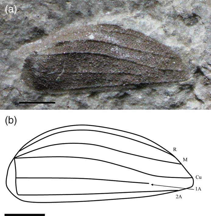 Description. Incomplete tegmen missing basal costal margin and tip. Preserved length 3.5 mm, width 1.8 mm. Tuberculate, with curved anterior margin and straight posterior margin. R faint and simple, runs parallel to curved anterior margin and may fade out just before the tip; M simple, gently curved then straightens out, probably terminates at tip; Cu simple, originating at same point as M, initially diverges from M then runs parallel to it, converging towards 2A and probably terminates at tip; A running straight posteriorly with simple 1A branching after half-way and may fade out before tip; 2A simple, runs parallel to posterior margin and probably terminates at tip.