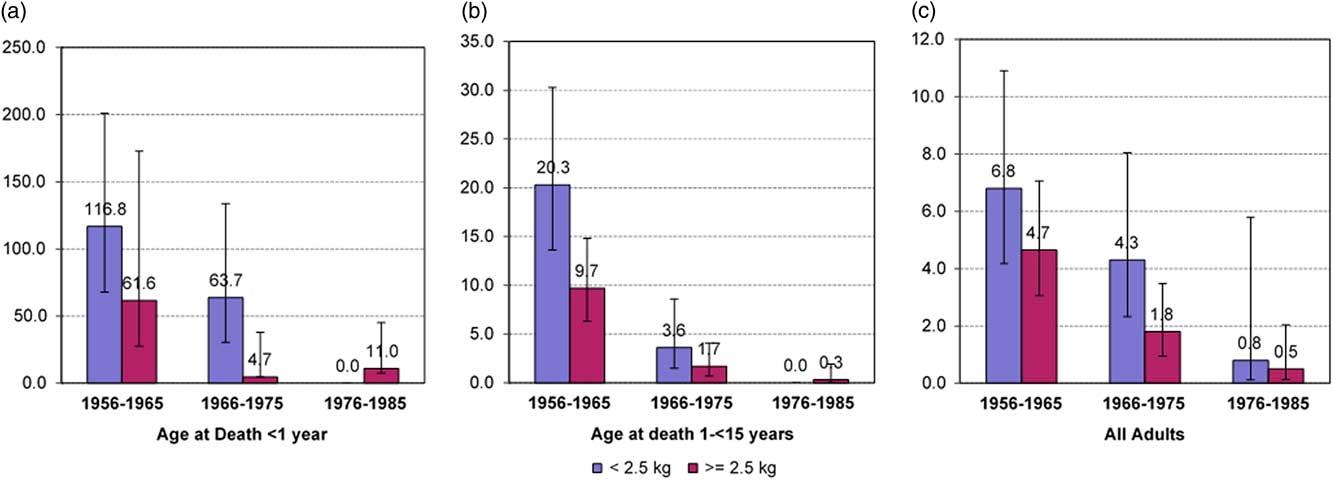 Fig. 1 Rates of natural death in infants (<1 year) (n=35) (a), Children (1−<15 years) (n=55) (b) and adults (⩾15 years) (n=61) (c) by birth cohort and birth weight below and above 2.5 kg. Rates are expressed as deaths per 1000 person-years.