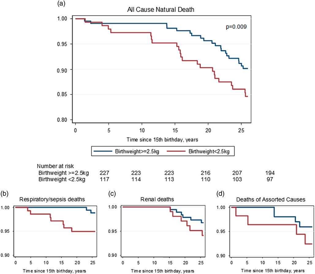 Fig. 5 Kaplan–Meier curves for all-cause natural (a) and primary causes of death (respiratory/sepsis (b), renal (c) and assorted causes (d)) in first 25 years of adult life, adjusted for year of birth and sex, and categorized by low birth weight (<2.5 kg) v. higher.