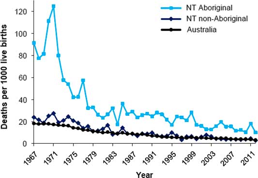 Fig. 6 Infant mortality, by Indigenous status, Northern Territory and Australia, 1967–2012.