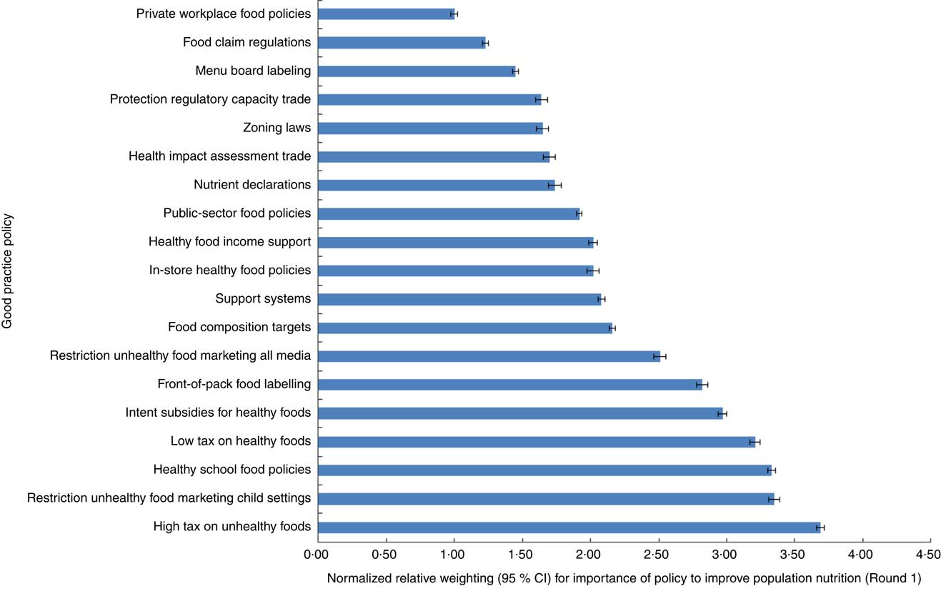 Fig. 1 (colour online) Bar chart showing the normalized relative weightings (with 95 % CI represented by horizontal bars) for each of the good practice policies to improve population nutrition derived from Round 1 of the Delphi process performed with international food policy experts (n 27) in 2015