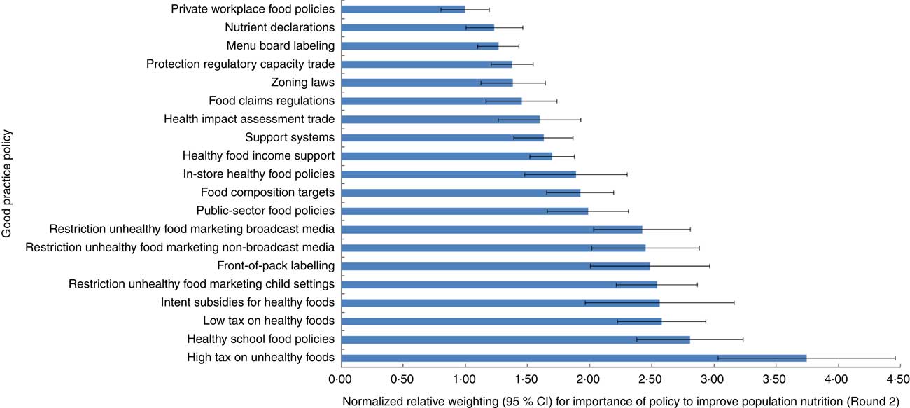 Fig. 2 (colour online) Bar chart showing the normalized relative weightings (with 95 % CI represented by horizontal bars) for each of the good practice policies to improve population nutrition derived from Round 2 of the Delphi process performed with international food policy experts (n 21) in 2015