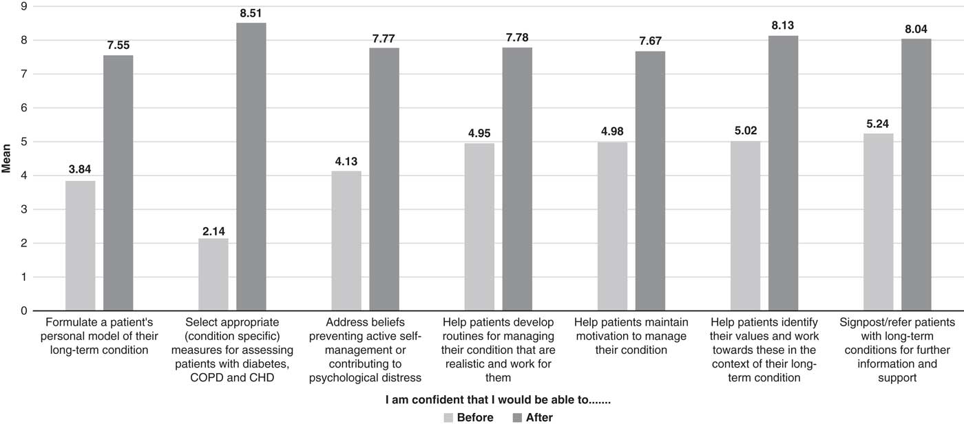 Mean scores for the self-efficacy items at baseline and follow-up are shown in Figure 3. Scores at baseline ranged from 2.14 (‘I am confident that I would be able to select appropriate (condition-specific) measures for assessing patients with diabetes, COPD and CHD’) to 5.24 (‘I am confident that I would be able to signpost/refer patients with long-term conditions for further information and support’). Scores for all seven items increased at the end of the workshop, ranging from 7.55 to 8.51.