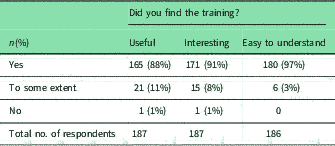 A feedback questionnaire embedded in the online training programme asked respondents to indicate whether they found the training useful, interesting and easy to understand (‘yes’, ‘no’ or ‘to some extent’). They were also asked to provide a satisfaction rating from 0 to 10 and invited to comment on what they liked about the training programme and how it could be improved.