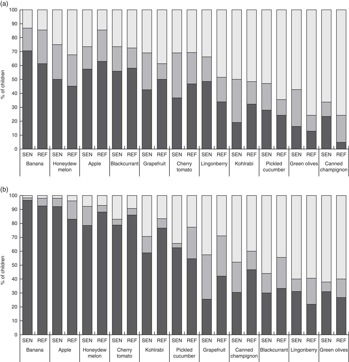 From the snack buffet, the children chose 6·9 (sd 2·9) items in the SEN group and 6·3 (sd 2·6) items in the REF group. Out of these selected items, the children consumed at least half, 4·8 (sd 2·4) items in the SEN group and 4·9 (sd 2·2) in the REF group. Children most commonly chose sweet and sour items from the buffet: bananas, apples, blackcurrants and honeydew melon (Fig. 1(a)). Other commonly chosen items were sweet and umami-flavoured cherry tomatoes and sour and bitter grapefruit and lingonberries. Less than half of the children chose kohlrabi, pickled cucumber, green olives and tinned champignon mushrooms, rendering ‘salty’ the least popular basic taste.