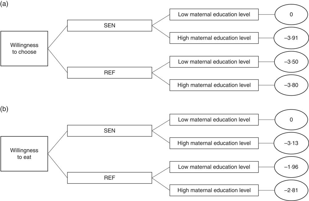 Sensory-based food education and maternal education also interacted with willingness to eat (Table 3, Fig. 2(b)). Among the children in the SEN group, high maternal education level decreased the children’s willingness to eat (Fig. 2(b), β=−3·13). By contrast, in the REF group, the decrease caused by maternal education level was non-significant (Fig. 2(b), β=−1·96 for low and β=−2·81 for high maternal education level).