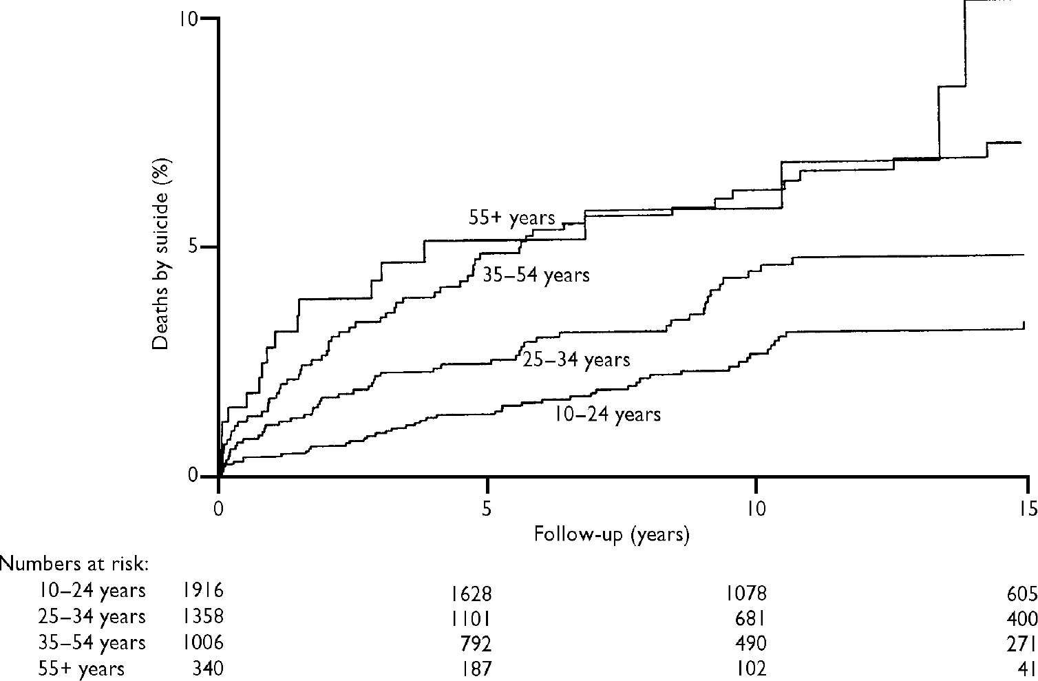 We have examined mortality from suicide over a long follow-up period in a large sample of people presenting for treatment of deliberate self-harm. The results show that the risk of suicide following self-harm is considerable and persists in the long term. It also varies with gender and age. Reduction in this risk must be a core element in national suicide prevention strategies (Department of Health, 2002).