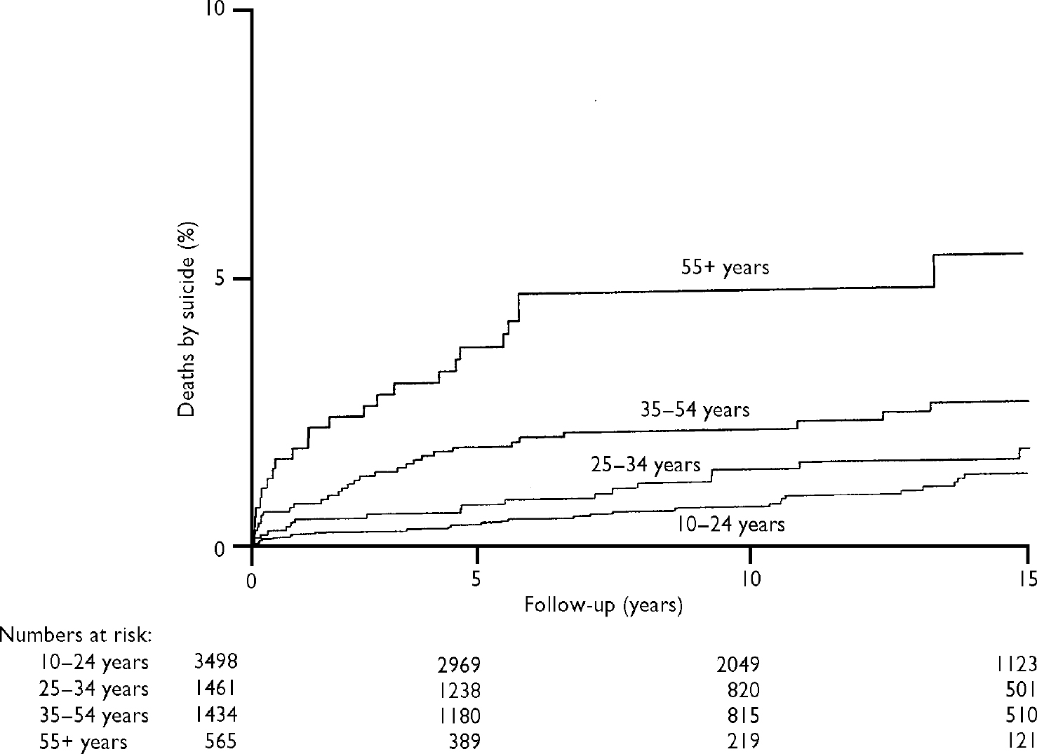 In keeping with the findings of most earlier studies (Reference Nordström, Samuelsson and ÅsbergNordström et al, 1995; Reference Sakinofsky, Hawton and Van HeeringenSakinofsky, 2000; Reference Suokas, Suominen and IsometsaSuokas et al, 2001) the risk of suicide was far higher in men than in women throughout the follow-up period. We have shown that the risk increases markedly with age at the time of self-harm. The risk in those aged 55 years and over was seven times greater than in those aged 10–24 years in the first year of follow-up, and nearly that after 5 years. This was reflected in the risk relative to the general population rate in different age groups. This underlines the need for clinicians to be especially vigilant for suicide risk in older people presenting with deliberate self-harm.