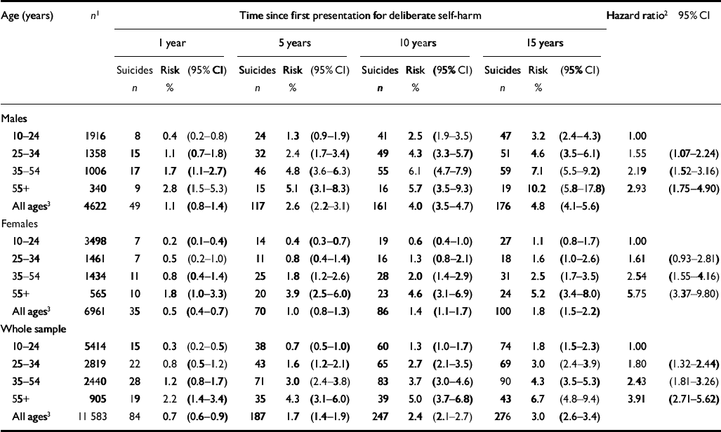 Suicide prevention is central to mental health policy in many countries (Reference Taylor, Kingdon and JenkinsTaylor et al, 1997; Department of Health, 2002). The strongest predictor of suicide is previous deliberate self-harm (Reference Sakinofsky, Hawton and Van HeeringenSakinofsky, 2000), which is found in 40–60% of suicides (Reference Hawton and FaggHawton & Fagg, 1988; Reference RygnestadRygnestad, 1988; Reference Suokas and LönnqvistSuokas & Lönnqvist, 1991; Reference Nordentoft, Breum and MunchNordentoft et al, 1993; Reference Foster, Gillespie and McClellandFoster et al, 1997). The most reliable figure for risk of suicide after deliberate self-harm in the UK was based upon a sample of patients identified in the early 1970s (Reference Hawton and FaggHawton & Fagg, 1988): 1% had died by suicide within a year. There are no recent statistics on the extent of risk. The incidence of deliberate self-harm has increased in the UK in recent years (Reference Hawton, Fagg and SimkinHawton et al, 1997), with an estimated 170 000 general hospital presentations per year (Reference Kapur, House and CreedKapur et al, 1998). In addition, the gender and age distribution for suicidal behaviour has altered, with marked increases in both suicide and self-harm in young men and a reduction in the female:male ratio for deliberate self-harm (Reference Hawton, Fagg and SimkinHawton et al, 1997; Reference Cantor, Hawton and Van HeeringenCantor, 2000). Little is known about how risk of suicide after self-harm varies with age, except that the risk increases with age in women (Reference Hawton and FaggHawton & Fagg, 1988; Reference Nordström, Samuelsson and ÅsbergNordström et al, 1995). Accurate and up-to-date detailed evidence on suicide risk after self-harm is important, especially in relation to targeting preventive efforts.