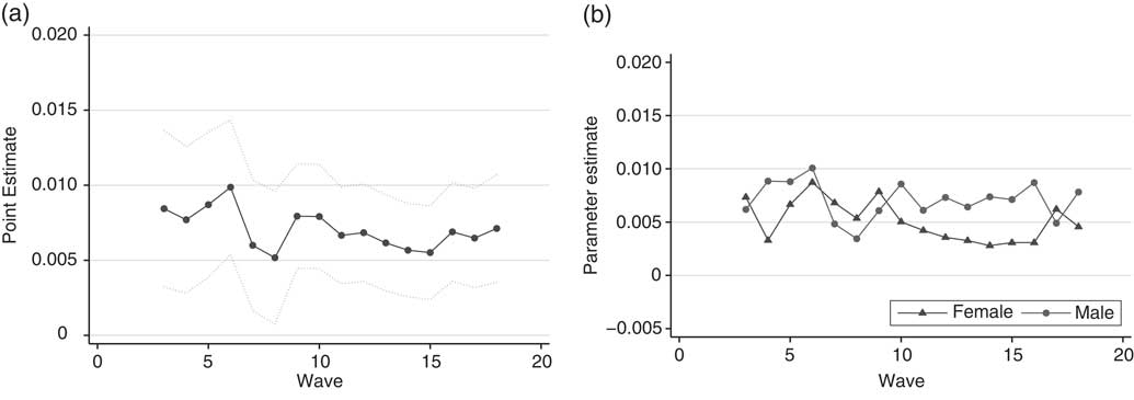 The results over time should give us pause in interpreting the IV results for women and men in Columns 8–11 of Table 5. When plotted over time, Wave 16 is an outlier; for most of the period the male and female income gradients track each other fairly closely, and are statistically indistinguishable. In sum, while there is suggestive evidence that it was stronger for women in the 1990s and then stronger for men in the 2000s, with the genders converging by the end of the period, the extensively overlapping confidence intervals suggest that we cannot detect a substantial gender difference in income’s effect on political preferences.