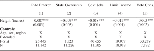 If our goal is to capture a more general sense of economic well-being, height arguably enjoys many advantages relative to income. First, height is increasingly collected in modern surveys, and self-reported height is arguably less prone to measurement error than income. Moreover, it is substantially easier to verify a respondent’s height in the course of administering a survey. Finally, unlike income, height is not subject to annual fluctuations. It thus proxies for permanent income, which drives preferences in canonical political economy models.Footnote 18