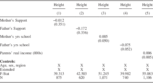 Note: least squares regression; dependent variable is height (in inches) for youths aged eleven to seventeen. Each row represents a separate regression. All specifications include age, sex, race, religion and region controls. Full models reported in the Appendix.