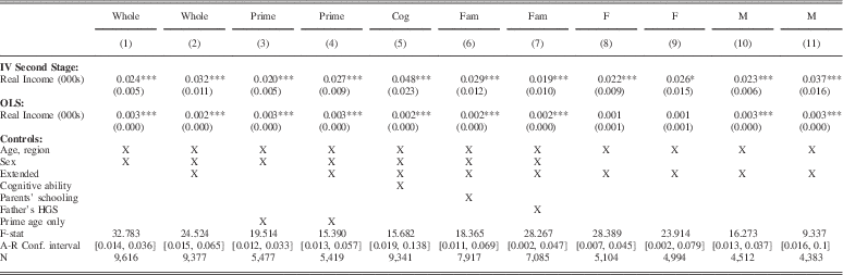 Note: dependent variable is ‘Real Income (’000s of pounds)’. First stage of 2SLS regression corresponding to Table 1. Extended controls include: married, white, years of schooling, religion. Full models reported in the Appendix. Heteroskedasticity-robust standard errors, clustered by household. Statistical significance: *10%; **5%; ***1%.