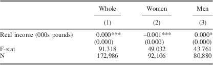 In the IV models presented in Table 5, the central independent variable of interest is real annual income, measured in thousands of pounds. The income variable we use includes income from labor and non-labor sources, but does not include income from government transfers. Throughout we employ a standard set of control variables: age, sex, region, race, educational attainment and religion, the construction of which is detailed in the Appendix.