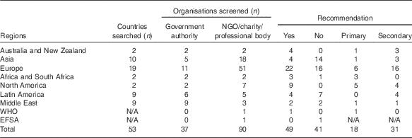 Many dietary guidelines have recommendations for specific food items – for example, cereal-based products, fruits and vegetables, milk and dairy products, and legumes. Less frequently whole-grains are included, but the extent to which they occur is unknown. Therefore, we conducted a survey of current whole-grain dietary recommendations, reviewing websites and personal communication with national governmental and professional health agencies/organisations using a network of nutritionists available to us. Recommendations, if present, were initially classified into two categories: (a) primary, where the recommendation was specific for whole grains and (b) secondary, where the recommendation was made in order to achieve another (primary) target, most often dietary fibre intake. The rationale behind any recommendations was noted where this information was provided. In all, fifty-three countries plus the WHO and EFSA were surveyed and results were obtained from 127 separate organisations, including national competent authorities, non-governmental organisations (NGO), charities and professional bodies, the WHO and EFSA (Table 2). Recommendations were variable and inconsistent and fell into three categories as shown in Table 3: specific recommendations where a target daily amount was specified; semi-quantitative recommendations where a recommendation was based on servings of cereal foods with proportions of whole grain suggested; and non-specific recommendations based on ‘eating more’ or ‘choosing’ whole-grain options. Specific recommendations adopted by government agencies, including target intake amounts, were found for only two countries (USA and Denmark). For some countries, different recommendations were found for NGO, charities or professional bodies but not for government – for example, in Australia the Grains and Legumes Nutrition Council( 35 ) suggests a whole-grain daily target intake of 48 g whole grain/d for adults and children aged 9 years and above, but the Australian Government Department of Health and Ageing Dietary Guidelines for Australians has only a generic recommendation ‘eat plenty of cereals (including breads, rice, pasta and noodles), preferably whole grain’. This inconsistency in approach largely arises from the rationale given for the recommendations, which are mostly associated with setting targets for dietary fibre intake and promoting whole grains as rich sources of dietary fibre, rather than being based on the health benefits of consuming whole grains per se. Thus, a gap exists between the scientific consensus that whole grains are beneficial to health and public health policies designed to promote healthy eating. A full list of the available recommendations can be found in the online Supplementary material.