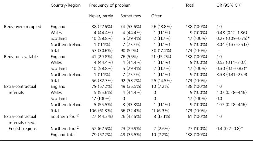 English trusts (particularly in southern regions) experience greater pressure on beds and consequently use ECRs more often than elsewhere. However, compared with reported mean four-year bed occupancy figures for London trusts of 98% (Reference Powell, Hollander and TobianskyPowell et al, 1995), and subsequent increases (Reference Hollander, Powell and TobianskyHollander et al, 1996), problems appear considerably less severe nationally than in the capital.