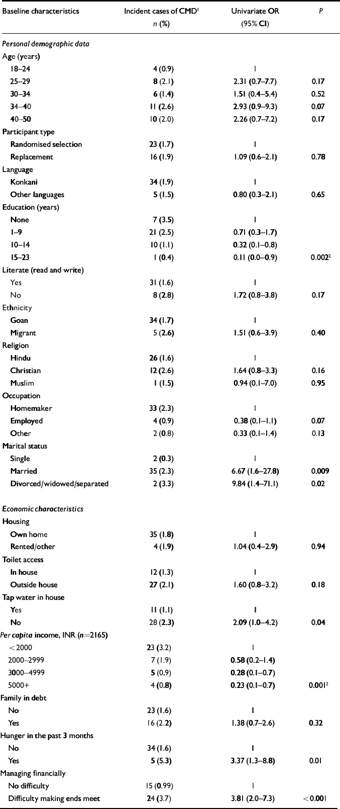 | Baseline characteristics | Incident cases of CMD1 n (%) | Univariate OR (95% CI) | P |