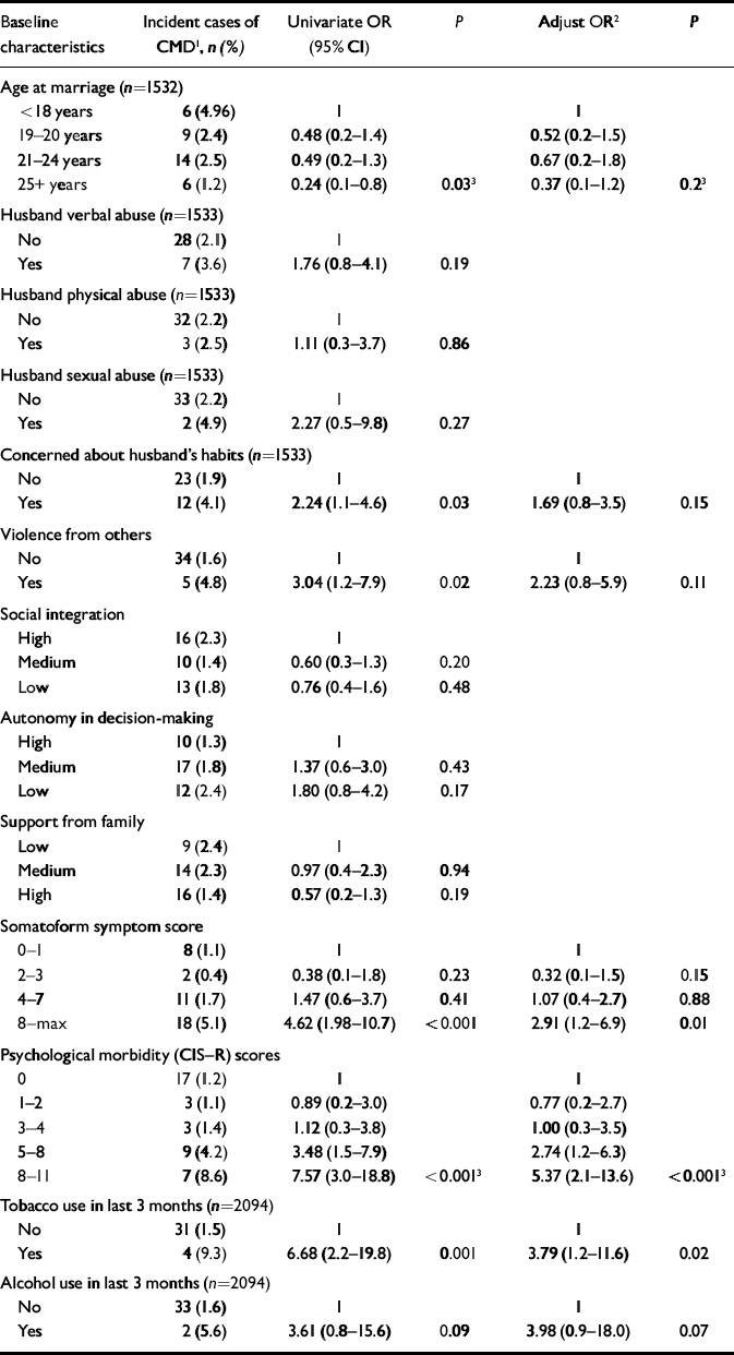 Analyses of the risk factors of common mental disorders were carried out for participants who completed at least one review and who did not have a common mental disorder at recruitment. Logistic regression was used for all analyses, with incident case of common disorder as the outcome. First, univariate analyses were performed for each socio-economic risk factor; all those with P≤0.1 were included in a multivariate model. The factors with P≤0.1 in this multivariate model were retained for subsequent analyses. Next, the associations of risk factors in the other domains (gender disadvantage, mental health and reproductive and physical health) with common mental disorder were estimated. The factors with P<0.1 in univariate analyses were adjusted for the socio-economic factors identified above; those for which P remained below 0.1, together with the socio-economic factors, formed the final multivariate model. Analysis of obstetric risk factors and factors associated with spousal relationships were restricted to married participants. In the final model, which included all the women, variables with missing values had the values recoded as 9. For categorical variables with evidence of linearity, a P-value for trend is shown; otherwise the P-value shows the overall significance of the variable. Continuous variables such as age, household income, autonomy score, social integration score, family support score, physical disability, somatoform disorders score, CIS–R score, household size and income were converted to categorical variables (e.g. tertiles or quartiles) based on the distribution of scores. Reproductive tract infections were treated as a composite variable of any reproductive tract infection or any sexually transmitted infection (chlamydia, gonorrhoea, trichomoniasis). All significance tests are two-tailed.