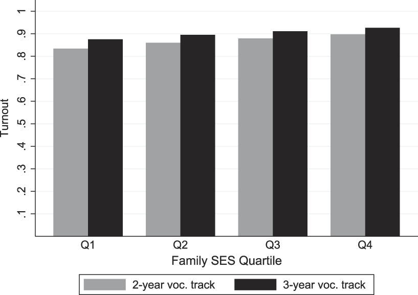 This section examines how the lengthening of vocational upper secondary education from two to three years affected voter turnout in the 2010 election. Figure 2 displays voter turnout by program length and family SES quartile for those attending vocational training programs. Four things can be noted. First, Sweden is a high turnout context. In the 2010 election, 84.6% of the electorate made use of their right to vote, and the average turnout rate in our main sample is as high as 90.0%. Second, despite the high average turnout rates, there are substantial differences in electoral participation across different family SES groups. Third, for all quartile groups, turnout is higher among those completing three-year vocational programs than among those completing two-year programs. Fourth, the voting gap between the two educational groups is smaller for individuals from more advantaged backgrounds. These results indicate that the lengthening of the vocational training programs may thus have helped increase and equalize voter turnout. However, an obvious problem with this analysis is that it is likely to suffer from endogeneity bias because the individuals choosing three-year vocational training programs are likely to have been different from those choosing two-year ones.