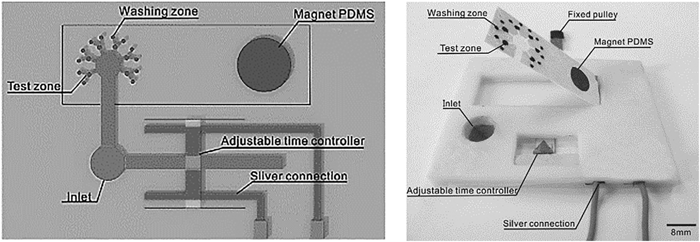 Figure 3. Programmed incubation time and active electromagnetic valving were implemented on a paper-based ECL assay, screening for protein cancer biomarkers α-fetoprotein (AFP) and carcinoma antigen 125 (CA-125) in human serum sample (reprinted from Ref. Reference Wang, Li, Ban, Du, Feng and Liu58 Copyright Sensors & Actuators B).