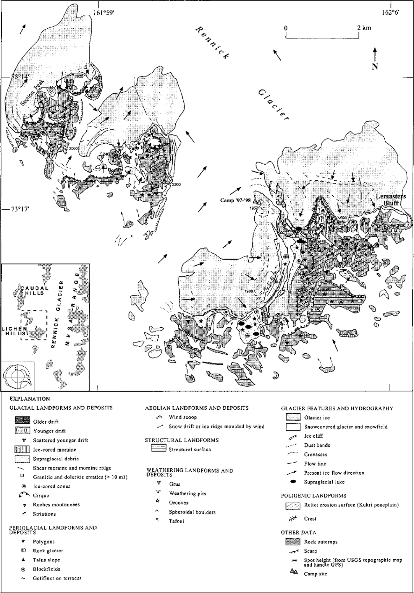 Fig. 2. Geomorphological sketch map of the Lichen Hills, upper Rennick Glacier.