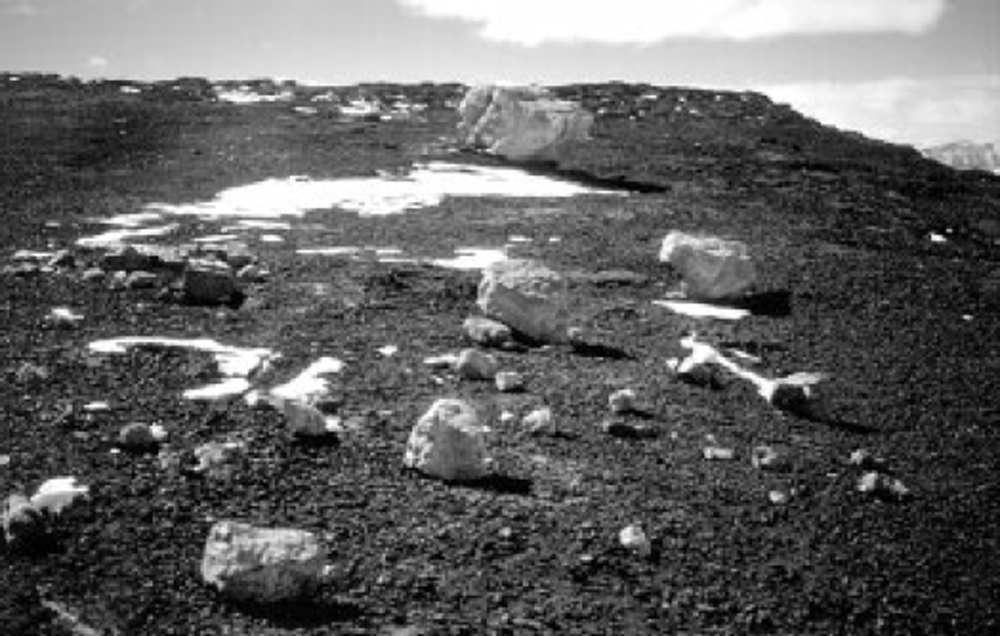 At the foot of the outcropping hills, where blue ice is present, supraglacial drift often shows bands of different lithology, with light-coloured granitic rocks alternating with dark-coloured volcanic rocks. We inferred that the formation of the strips was due to the progressive reduction of the ice from its last maximum level to the present, in conjunction with the exposure of different rock units. The lowering of the glacier surface is shown by scattered, slightly weathered, erratic blocks on the top of the hills and by glacial deposits found at various levels. Polished and striated rocks with crescentic gouges are frequent on the granitic surfaces (Fig. 2).