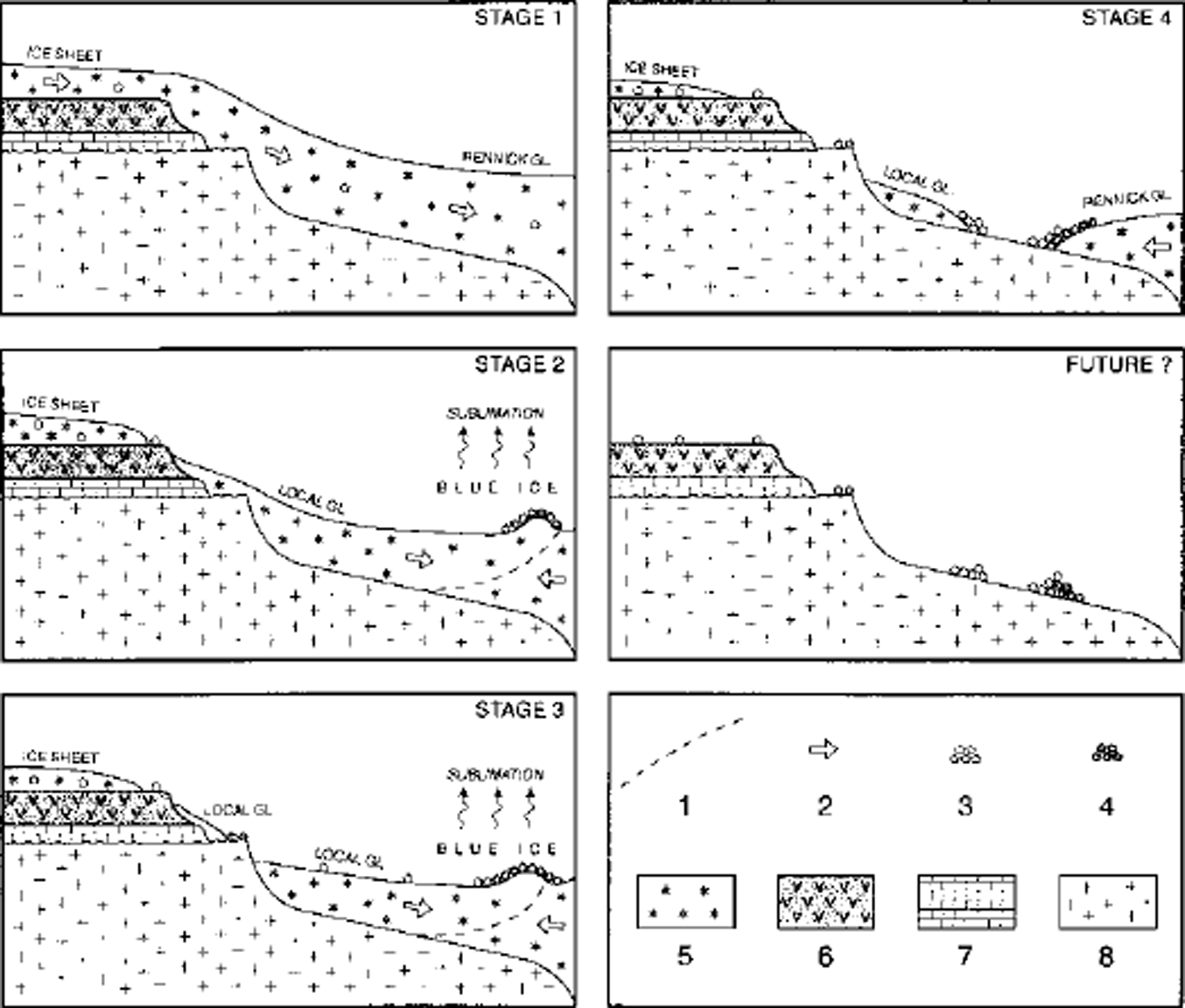 Stage 1 shows the situation corresponding to the LGM, with the ice thicker than at present. The presence of slightly weathered granitic erratics on the top surface of the Lichen Hills is evidence of a glacial advance, although we did not find any evidence of a complete overriding of the nunataks. The extent of the glacial advance is difficult to establish, for several reasons: (a) the ice sheet covering the nunataks should have been very poor in sediment load, so it may not have left any erratics; (b) the possible presence of volcanic glacial drift is hard to detect because of the homogeneous lithological composition of the rock; (c) volcanic formations rarely preserve glacial erosional forms, such as striae and roches moutonnees. The presence of fine chiselled rocks along the rim of the top surface reveals a prolonged exposure to weathering. This leads us to believe that these forms were created before the LGM and that during the LGM the Lichen Hills may have been only partially covered by ice from the plateau, with ice-free areas remaining. During the LGM, Rennick Glacier would have been higher than at present and the difference in height between Rennick Glacier and the plateau surface to the west-southwest would have been less. In this situation the turbulence necessary for the creation of blue-ice areas would not have been generated by the katabatic wind, and the ice was entirely discharged down-valley