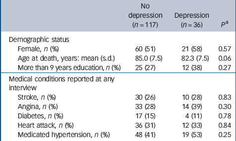 Of the 456 participants for whom neuropathological data were available, 243 had a probable diagnosis of dementia in life, and 30 whose dementia status was unknown and a further 30 whose depression status was unknown were also excluded. Of the remaining 153 participants, 36 (24%) had depression on at least one assessment. Characteristics of the analysed sample are summarised inTable 1. No significant differences were found between those with or without depression in any characteristic apart from a lower mean age at death in those with depression. The median time between the final interview and death was 1.1 years (IQR = 0.6–1.8) for those with depression and 1.0 (IQR = 0.6–1.6) for the remainder (Wilcoxon rank-sum test P = 0.58). Braak stage was recorded in 91 cases. Parkinson's disease was reported by six participants, three with depression in at least one assessment. Factors associated with depression at the baseline assessment of the source MRC CFAS sample have been previously reported. Reference McDougall, Kvaal, Matthews, Paykel, Jones and Dewey26 The median post-mortem interval was 42 h (IQR = 24–72) for those with previous depression and 24 h (IQR = 18–48) in the remainder (Mann–Whitney U-test P = 0.08). There were no significant associations between post-mortem interval and any of the pathological measures applied in this analysis apart from one between longer interval and hippocampal neuronal loss (P = 0.035).