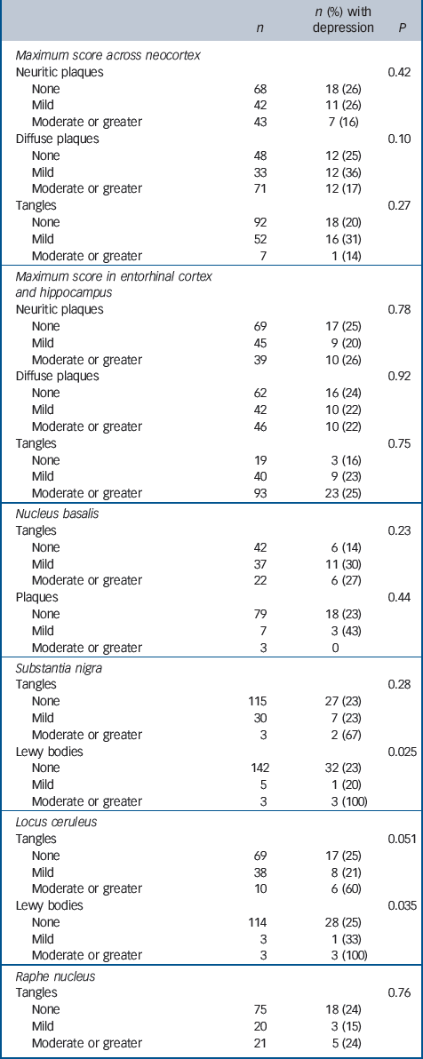 (d) Neuropathology in subcortical brain areas: the four subcortical areas considered were the substantia nigra, nucleus basalis, any raphe nucleus and locus ceruleus. Plaques and tangles were assessed in each of these areas, as well as the presence of Lewy bodies and whether neuronal loss was observed. Each of these measures was recorded on the four-point scale above. Complete subcortical examination was not available for the entire cohort, although this was not related to the likely presence or absence of neuropathology, and in no brain area were missing pathological data significantly associated with depression (data not shown).