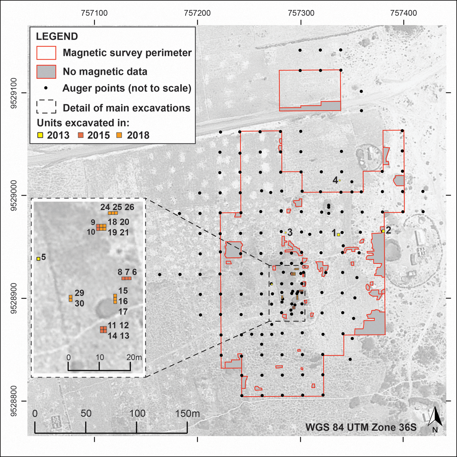The first test trenches excavated in 2013 (Units 1–5) were located based upon surface artefact densities, shovel test pits and observations during modern pit-latrine construction (Grillo et al. Reference Grillo2018). Units that were poor in cultural material (Units 3 and 5) were later found not to be located near any magnetic anomalies. Unit 4 (also poor in cultural material) was not covered by the magnetic survey and Unit 2 (with abundant midden deposits) was located across the eastern edge of the magnetic survey area. Unit 1 had abundant midden deposits but was located approximately 2m and 6m away from two small magnetic anomalies.