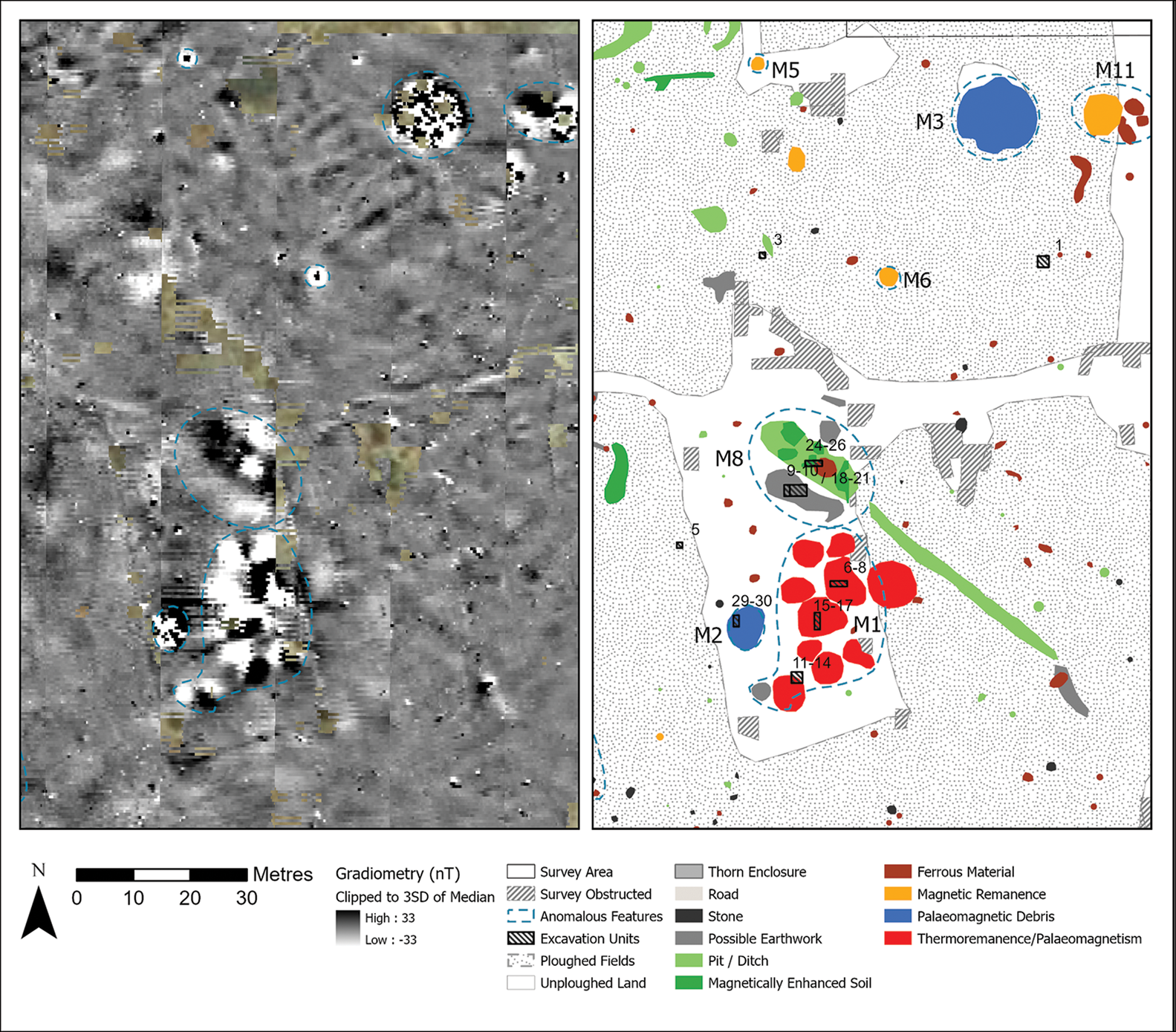 Based on the presence of boulders in Units 15–17, the partial destruction of some of the magnetic anomalies in the plough zone and the slight differences in the form of anomalies within the cluster, we hypothesise that the clustered magnetic anomalies in M1 may have multiple sources related to both anthropogenic thermoremanence and palaeomagnetism. Although the areas so far opened through excavation are limited in extent, additional research, including an ongoing laboratory-based magnetic susceptibility study of samples taken from these excavation units, is in progress to elucidate the nature of M1.
